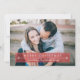 Presentamos un delicioso diseño de tarjetas de fotos de Navidad que coloca tu preciada foto al frente, creando un entorno cautivador para tus saludos de vacaciones. El diseño abarca simplicidad y elegancia clásica, asegurando que la imagen de su familia ocupe el centro de la escena en esta creación festiva. El diseño de la tarjeta presenta una combinación de colores atemporal y tradicional, con un rico y clásico tono rojo que le da un toque de alegría al espíritu vacacional. Un rectángulo semitransparente sobrepone la parte inferior del diseño, proporcionando un contraste visualmente sorprendente contra la foto. Este elegante rectángulo rojo sirve como el lienzo perfecto para el sincero mensaje "Feliz Navidad". Las palabras, cuidadosamente elegidas y dispuestas, exudan calidez y alegría, capturando la esencia de los saludos de la temporada. Junto al saludo se encuentra una firma familiar personalizado, que le da un toque personal que recuerda a los destinatarios el amor y la unión que definen las celebraciones de la fiesta de su familia. La firma sirve como un recordatorio sincero de que esta tarjeta viene directamente de tu familia, y que transmite alegría y buena voluntad a los que la reciben.