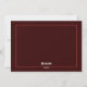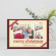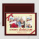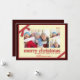 Tres espacios para fotos familiares son envueltos como una imagen en este diseño rojo y marrón que presenta letras cosidas que desean a sus seres queridos y amigos una Feliz Navidad de tu familia a la de ellos. El año opcional en la esquina superior derecha se puede eliminar fácilmente si se deja en blanco el bloque de texto.