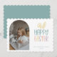 Festividad de la foto de Pascua Feliz. Características, tipografía pastel con acento de oído conejo, marco de foto arcaico y color de respaldo verde azulado de coordinación.