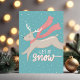 Una tarjeta navideña plana no denominacional con letra a mano que dice "que nieve" y una ilustración caprichosa de un reno con bufanda en medio de un paso de baile en la nieve. Envíala a todos aquellos a quienes consideras "preciosos" esta temporada navideña.