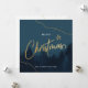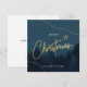 Un hermoso y lujoso diseño de paisajes de árboles de Navidad con elementos de líneas doradas y salpicaduras de nieve. Sobre un paisaje de color azul oscuro con muchos pinos. Navidades en tipografía dorada, pequeños copos de nieve dorados y salpicaduras de pintura. Con elegantes líneas doradas modernas sobre un fondo azul-verde oscuro con siluetas de pinos. Diseño de tarjetas de Navidades de lujo por Luckz.