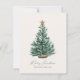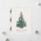 Un delicado ilustracion acuático de un árbol de Navidad pintado en tonos verdes. El árbol tiene un aspecto lleno y exuberante, con ramas que se extienden simétricamente. Una pequeña estrella dorada se sienta sobre el árbol, añadiendo un toque de elegancia. El árbol aparece parado sobre un tosco muñón de madera, lo que sugiere que se ha cortado recién. La sencillez del fondo blanco permite al espectador centrarse únicamente en la belleza del árbol.