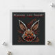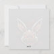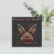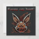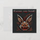 Esta tarjeta de Pascua es bastante peculiar y humorística, con un conejito de aspecto zombi que parece haber salido directamente de una película de terror. Tiene ojos amarillos y una risa diabólica. El fondo de la carta es de color oscuro, lo que refuerza la atmósfera aterradora de la escena. Encima del conejito, la frase "Caza de huevos feliz" está escrita en letras mayúsculas, con un tipo de letra bastante divertido. A pesar del lado ligeramente morboso del conejito, el mensaje sigue siendo divertido y recuerda al espíritu de la tradicional caza de huevos en Pascua.