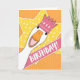 Este es un divertido diseño de tarjetas de cumpleaños en naranja, amarillo y rosa. El diseño presenta un ilustracion de un pato blanco de aspecto alegre, vestido con un gorra fiesta rosa. El pato se coloca diagonalmente a través del marco. Detrás del pato hay una gran estrella amarilla con un patrón de estrellas blancas. El fondo es naranja con franjas naranjas pálidas. En la parte inferior derecha de la tarjeta está el texto BIRTHDAY! también colocado diagonalmente a través del marco. Todo esto es una tarjeta de vibración divertida, brillante y feliz. Diseño y Ilustracion por Natalie Kinnear