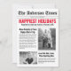 Esta fantástica tarjeta fotográfica de vacaciones incluye un tema periodístico que personalizar con titulares divertidos, texto de la historia y fotos. En la parte superior, el nombre del periódico es personalizado con su nombre y el titular principal / saludo dice "FESTIVIDADES MÁS FELICES". En la parte de atrás hay una historia más y una foto horizontal. Simplemente reemplaza las fotos temporales con tus fotos y cambia el texto - ¡es muy fácil! Este es un diseño maravilloso para aquellos que quieren destacar ciertos eventos o hitos del año - perfecto para familias!!