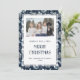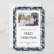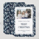 Fotos mágicas azules Marea tarjeta navideña con un bosque encantado con un zorro, botánicos folclóricos y ornamentos nórdicos. Personaliza fácilmente esta tarjeta azul de vacaciones con tu foto y nombre de familia.