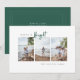Diseño moderno de tipografía minimalista con tarjeta de foto navideña "Merry & Bright". Características, tres espacios verticales de fotos, guión "brillante" verde festivo y respaldo de color verde coordinado. Líneas de texto de plantilla para el nombre de familia en la parte delantera, mensaje y nombres en la parte posterior.