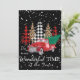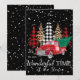 Este diseño presenta un camión rojo vintage con un árbol de Navidad en la parte posterior y árboles de plaid y estampado de animales detrás con nieve que cae. También hay texto en la parte inferior que dice, "Es la época más maravillosa del año"
