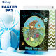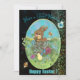 Esta tarjeta de Pascua presenta a un conejito de Pascua muy lindo sosteniendo a un pequeño pollito en un fondo oscuro rodeado de un prado con muchas flores silvestres coloridas y otro pollito que deambula con abejorros volando alrededor. Diviértete con esta tarjeta, puedes pedirla impresa o descargarla. Puedes personalizar el saludo en la parte inferior y el texto en la parte superior.