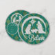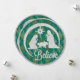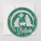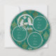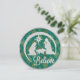 Tarjeta plana de natividad redonda tradicional. Jesús, María y José con fondo turquesa y dorado. Purpurina plateado y lustre dorada brillante. Foto y texto editable.