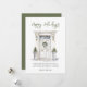 Imagen de puerta principal con decoración de agua de "Felices Fiestas" con guión moderno decorada con vegetación festiva.