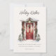 Tarjeta plana de vacaciones con imagen de puerta principal decorada con vegetación festiva y espacio adicional en la parte posterior para mensaje personal con guión moderno "Deseos de fiestas" en acuarela.