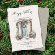 Tarjeta plana de vacaciones con imagen de puerta principal decorada con vegetación festiva y escritura moderna "Felices Fiestas" con espacio adicional en la parte posterior para mensaje personal.