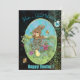Esta bonita tarjeta de vacaciones de Pascua presenta a un lindo conejito de Pascua que sostiene a un pequeño pollito sobre un fondo oscuro rodeado de un prado con muchas flores silvestres coloridas y otro pollito que deambula por allí con abejorros volando alrededor. Diviértete con esta tarjeta, puedes pedirla impresa o descargarla. Puedes personalizar el saludo en la parte inferior y el texto en la parte superior.