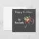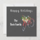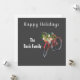 El diseño festivo incluye un ilustracion de acuarela en bicicleta roja con una cesta llena de vegetación de invierno y decoración de temporada. Saludo de personalizable y personalización con una fuente gris muy clara en el fondo gris de la pizarra.