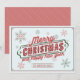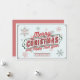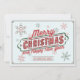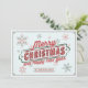 Tarjeta de Navidades de diseño vintage con tipografía de tipo "Feliz Navidad y Feliz Año Nuevo" en forma de cartel marqués iluminado. Diseñado con colores rojos y verdes sobre un fondo rayado azul claro diagonal. Rodeado de copos de nieve de bonito diseño. Personalizar con su nombre y año al frente.