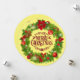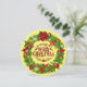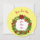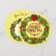 Tarjeta plana redondeada de flor tradicional de navidad. Navidades Pine y Holly Wreath con Pinecones, Poinsettias, ornamentos en un fondo amarillo. Con la navidad del cuero oscuro rojo. Tarjeta editable de texto y foto.