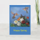 Escena de la primavera con las flores y pájaros y un gato curioso del smoking
