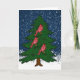 Un árbol verde paisajista está siendo ocupado por tres cardenales rojos paisley en un fondo nevado. Añade tu propio texto para un saludo de solsticio de invierno.