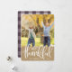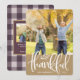 La cédula de festividad de Acción de Gracias muestra su foto favorita de otoño con un borde inferior de una rústica kraft marrón. "Agradecimiento" está escrito con letras blancas, con sus nombres y el año por debajo. Personalice la parte de atrás con una foto adicional y un mensaje de Acción de Gracias.