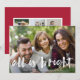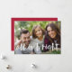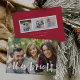La tarjeta fotográfica festiva incluye tu foto horizontal o paisajística favorita en todo el sangrado, con "todo es brillante" colocado en la tipografía de pincel con letras blancas. Personalice la parte delantera de la tarjeta con sus nombres y mensajes breves de vacaciones (mostrados con "Feliz Navidad"), y agregue tres fotos adicionales a la parte posterior en un diseño de collage sobre un fondo rojo vibrante, junto con un mensaje personal personalizado. Para una parte posterior en blanco, simplemente elimine las plantillas de fotos y la capa mate blanca.