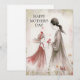 Un ilustracion acuarela reconfortante que representa un momento tierno entre una madre y su hija. La hija, vestida con un vestido rojo que corre y con una cabecera a juego, ofrece con cariño un pequeño ramo de flores rojas a su madre, vestida con un elegante vestido gris. Rodeado de suaves elementos florales y de un fondo pastel de ensueño, esta obra de arte captura con gusto el espíritu del amor, la gratitud y las simples alegrías del Día de la Madre