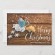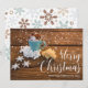 Copa cálida de café con Navidades de canela y copos de nieve en la tarjeta de fotos navideña de mesa de madera