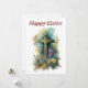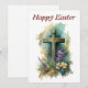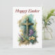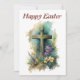 Una colorida tarjeta de felicitación de Pascua con una cruz en una colina, rodeada de flores y un árbol y una iglesia en el fondo. Se puede comprar como tarjeta de felicitación física o como archivo de descarga digital de alta resolución para imprimirlo.