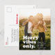 ¡Sólo en esta temporada de fiestas hay más alboroto! Envíe una divertida tarjeta de vacaciones de estilo retro con este diseño de una foto. El tipo de retroceso dice "sólo vibraciones alegres" y también tiene espacio para un mensaje, nombre y año personalizado. La parte posterior tiene espacio para un mensaje personalizado, pero se puede dejar en blanco para que pueda escribir un mensaje más personal.