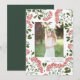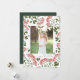 Elegante tarjeta fotográfica navideña incluye una foto favorita rodeada por un borde de frondosos follaje botánico verde y pequeñas flores de color rojo acuático. El saludo de vacaciones de su personalizado y el nombre o nombres de su familia aparecen debajo de su foto con letras grises de moda. Personaliza la parte posterior con dos fotos adicionales y un mensaje personal contra un fondo verde cazador.