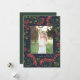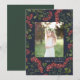 Elegante tarjeta fotográfica navideña incluye una foto favorita rodeada por un borde de vegetación botánica exuberante y pequeñas flores de color rojo sobre un rico fondo azul marino. El saludo de vacaciones de su personalizado y el nombre o nombres de su familia aparecen debajo de su foto con letras blancas de moda.