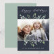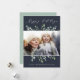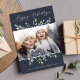Festividad y elegancia en tonos verde pálido, jade gris y blanco, nuestra tarjeta fotográfica de vacaciones Winter Sage presenta tu foto favorita horizontal o orientada al paisaje enmarcada por hojas botánicas verdes esbozadas en un fondo azul marino profundo dramático. "Felices Fiestas" aparece en la parte superior de la escritura moderna de caligrafía. Personalice el saludo de su personalizado, su nombre o apellidos y el año que viene al final.