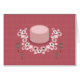 Tarjeta del festival de mediados de otoño con una torta de luna rosa, flores y farolillos chinos.