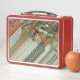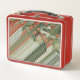 Durable metal lunch box with festive red trim.