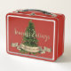Una metalizado caja de almuerzo clásica que se puede personalizar. Con un tradicional árbol de Navidad decorado, cinta dorada y la frase "Comidas de temporada". Adecuado para todas las sobras de Felices Fiestas