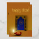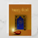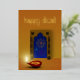 Feliz ilustracion Diwali: diya roja (lámpara de aceite india en forma de taza) frente a una ventana ornamental india con fuegos artificiales afuera.