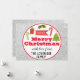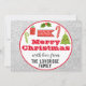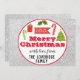 Festividad Feliz Navidad con un purpurina plateado que brilla el borde y el fondo blanco. Las palabras "Feliz Navidad" están escritas en un audaz guión rojo. La tarjeta está decorada con pequeños ilustraciones adorables como un árbol de Navidad, latas de caramelo rojas y verdes, un regalo y hojas huecas. En la parte inferior del pegatina están las palabras "con amor de" y el apellido de su familia.