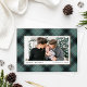 Esta clásica y elegante tarjeta de vacaciones personalizado "Festividades Felices" Navidades incluye una foto del paisaje enmarcada por una moda festiva y rústica sagebrush color verde y tartán negro con verdaderos acentos de Relieve metalizado de oro rosa. Personalice con su elección de saludo de vacaciones, la moderna firma familiar en escritura de escritura, el año, y elija incluir un mensaje adicional en la parte posterior de la tarjeta. En la parte trasera también se incluyen dos espacios de fotos adicionales.