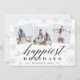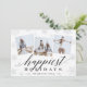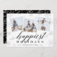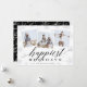 Elegante tarjeta de fotos de vacaciones cuenta con tres fotos cuadradas en un diseño de collage, con "Festividades más felices" colocadas en un guión negro clásico y letras en bloques con sutiles copos de nieve en el fondo. Personalice su nombre y el año siguiente. Las tarjetas cambian a un fondo con motivos botánicos negros y crema. Una selección moderna y minimalista impresa en un grueso cartón blanco con letras negras.