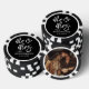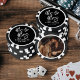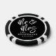 These custom poker chips feature a clean black background on one side with all text in white for a classic and elegant look. “Mr. & Mrs.” appears in large white handwritten script, with the couple’s last name and wedding date placed directly below in a refined white serif font for a balanced finish. The other side can feature a favorite photo of your choice, keeping the design personal and memorable.