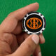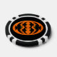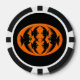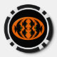 Este impresionante juego de fichas de póquer tiene un oval naranja con seis cuervos. Cada cuervo tiene ojos amarillos con pupilas negras y alas estiradas. Los cuervos están volando unos hacia otros formando una forma oval. El fondo es negro.
