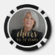 Estos personalizados chips de póquer de 70 años muestran la foto del invitado de honor, junto con la palabra "Cheers" en un elegante guión de caligrafía de color dorado. Una pantalla oscura ayuda a hacer que el texto aparezca. ¡Una gran manera de celebrar a alguien que cumple setenta años!
