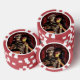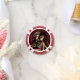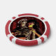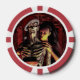 Funny skeleton wearing a Santa hat and holding a gift. Pretty woman holding the skeleton.