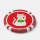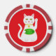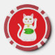 Este impresionante conjunto de fichas de póquer presenta una imagen gráfica de un afortunado gato oriental blanco ondulado. El gato tiene hermosos ojos de oro y lleva puesto un medallón de oro en el cuello. El gato tiene orejas y bigotes rosas. Este lindo gatito sostiene una ficha de oro con entrada de jade verde y un mensaje en texto dorado que dice "Buena suerte".