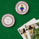 Este impresionante juego de fichas de póquer incluye un árbol de Navidad con dos pequeños símbolos femeninos rosados sentados encima del árbol. Cada capa del árbol es un color diferente del arcoiris. El árbol se sienta en una olla marrón y está rodeado de regalos. Cada uno de los presentes es también un color del arcoiris, con una cinta y un arco de color arcoiris diferentes. Un bonito diseño para parejas lesbianas este Navidad. Hay texto personalizado en la parte posterior para que puedas incluir los nombres de la pareja feliz. Estas fichas también harían encantadores favores de la boda.