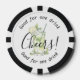 Un vale o ficha de bebidas divertidos y modernos para su celebración, con sus nombres y fecha al revés. Una bebida Mojito color agua presentada en la parte delantera del chip de póquer con Cheers en una bonita letra de guión.
