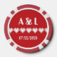 Dé a los invitados, damas de honor, padrinos, o a cualquier otra persona que asista o ayude con su boda o evento especial una diversión con estos chips de póquer de personalizable. Un lado del chip de póker tiene un corazón pixelado blanco sobre un fondo rojo cereza brillante. El otro lado tiene una muestra de iniciales y fecha separadas por un patrón de video juegos retro relacionados con corazones de 8 bits. El texto de ejemplo se puede personalizar con sus propios detalles o con un mensaje especial de su elección para crear una ficha única y personal para conmemorar su gran día. Este diseño coincidirá con cualquier producto de la línea Nuestros corazones de 8 bits en cerezo para que pueda hacer de su boda temática de juegos o evento especial tan coordinado como desee.