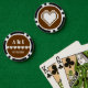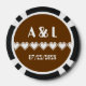 Dé a los invitados, damas de honor, padrinos, o a cualquier otra persona que asista o ayude con su boda o evento especial una diversión con estos chips de póquer de personalizable. Un lado del chip de póker tiene un corazón pixelado blanco sobre un fondo marrón chocolate rico. El otro lado tiene una muestra de iniciales y fecha separadas por un patrón de video juegos retro relacionados con corazones de 8 bits. El texto de ejemplo se puede personalizar con sus propios detalles o con un mensaje especial de su elección para crear una ficha única y personal para conmemorar su gran día. Este diseño coincidirá con cualquier producto de la línea Nuestros corazones de 8 bits en chocolate para que pueda hacer que su boda temática de juegos o evento especial esté tan coordinado como desee.