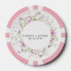 Estos chips de póquer personalizado presentan un color rosa pastel con un diseño de motivos de flores silvestres alrededor de los bordes y en el centro. Estos chips de póquer se utilizan probablemente como exclusivos favores de boda o como parte de la celebración, ofreciendo a los invitados un memorable descanso del día especial. El diseño es distintivo y adecuado para un boda con su elegante temática floral y su suave paleta de colores.
