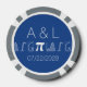 Dé a los invitados, damas de honor, padrinos, o a cualquier otra persona que asista o ayude con su boda o evento especial una diversión con estos chips de póquer de personalizable. Un lado del chip de póquer tiene un gráfico blanco sobre un fondo azul zafiro rico. El otro lado tiene un conjunto de muestras de iniciales y fecha separadas por un patrón de iconos relacionados con las matemáticas, incluyendo una espiral de Fibonacci, integral, gráfica y la pi constante. El texto de ejemplo se puede personalizar con sus propios detalles o con un mensaje especial de su elección para crear una ficha única y personal para conmemorar su gran día. Este diseño coincidirá con cualquier producto de la línea It Suma en azul para que pueda hacer que su boda o evento especial con temática matemática esté tan coordinado como desee.